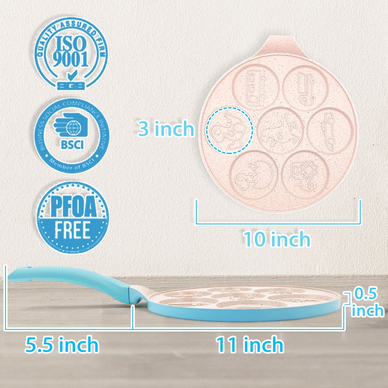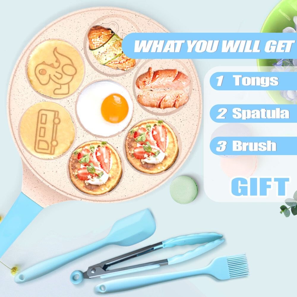 Warm Tips: Aluminum offers super conductivity, providing exceptional heat retention and distribution than traditional cast iron pan. Our non-stick pan conducts heat quickly for great performance at low heatEgg Pan Size: 10 inches diameter, 1/2 inches height, each pancake mold measure 3 inches. 17 Inches length including the silicone handle. Pan Made of die cast Aluminum7-Cups Cute Dinosaur Car, and Truck Character. Perfect for cooking omelets, bacon, burgers, pancakes, eggs,etcEvenly Heats: 7-cups pancake pan heat up faster than traditional nonstick cooking pancake pans, making cooking faster and easier, saving you effort and time for breakfast. Our Pancake pan comes with silicone spatula, tong and oil brush to help you easy cook what you wantEasy Clean and Care: This fried egg pan can cook on gas stove, grill stove. Induction Cook tops not available; Do not put in dishwasher as it will shorten the life of the nonstick coating on the pan. Just use a soft sponge or cloth to remove oil stains easily
