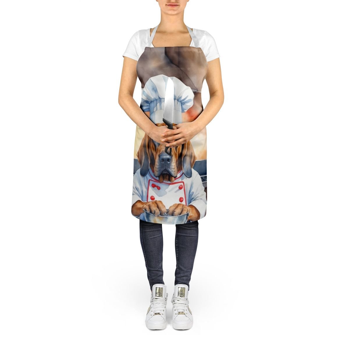 Apron featuring breed specific Bloodhound artwork. Elevate your cooking, baking, and grilling experiences with our versatile Kitchen or BBQ Apron. This Bib Style apron isn't just limited to culinary activities - it also serves as an excellent baking apron, artist apron, server apron, gardening apron, or even a dog grooming apron. The apron showcases vibrant full-color artwork contributed by one of our talented artists, bringing a dash of style to your daily tasks. With dimensions of approximately 27"W x 30"H, it provides ample coverage to protect your clothing from spills and splashes. Our apron is meticulously crafted from 100% Ultra Spun Polyester, known for its durability and lightweight nature. The apron comes with white tie straps, ensuring a comfortable and adjustable fit for all. It's a perfect choice for kitchen apron enthusiasts, whether you are a woman or a man. Designed for easy maintenance, this apron is fully machine washable. The quick-drying polyester material actively reduces staining, keeping your apron looking fresh and new for longer. Our beautifully designed apron isn't just a functional kitchen accessory - it's a fashion statement in the culinary world!