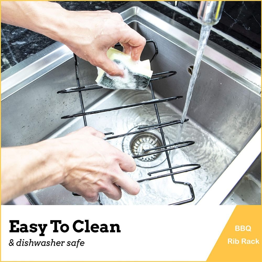 Easy clean up giving you more time to enjoy the party & dishwasher safe - our well made & durable easy to transport rib holder is constructed from a heavy duty steel wire with a nonstick coating; making clean up a breeze. Simply toss it in the dishwasher when you are done or quickly clean by hand with mild soap & water; nice & easy.