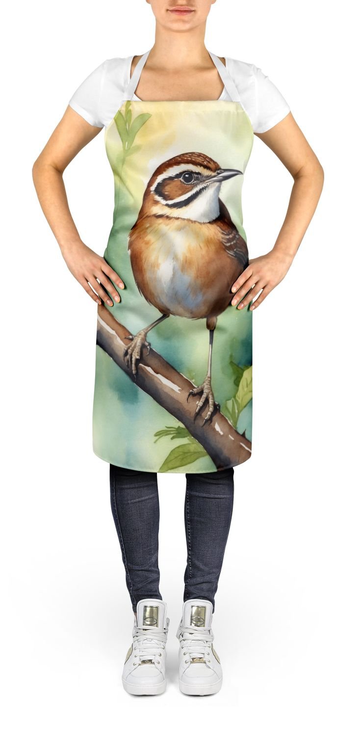 Apron featuring breed specific Carolina Wren artwork. Elevate your cooking, baking, and grilling experiences with our versatile Kitchen or BBQ Apron. This Bib Style apron isn't just limited to culinary activities - it also serves as an excellent baking apron, artist apron, server apron, gardening apron, or even a dog grooming apron. The apron showcases vibrant full-color artwork contributed by one of our talented artists, bringing a dash of style to your daily tasks. With dimensions of approximately 27"W x 30"H, it provides ample coverage to protect your clothing from spills and splashes. Our apron is meticulously crafted from 100% Ultra Spun Polyester, known for its durability and lightweight nature. The apron comes with white tie straps, ensuring a comfortable and adjustable fit for all. It's a perfect choice for kitchen apron enthusiasts, whether you are a woman or a man. Designed for easy maintenance, this apron is fully machine washable. The quick-drying polyester material actively reduces staining, keeping your apron looking fresh and new for longer. Our beautifully designed apron isn't just a functional kitchen accessory - it's a fashion statement in the culinary world!