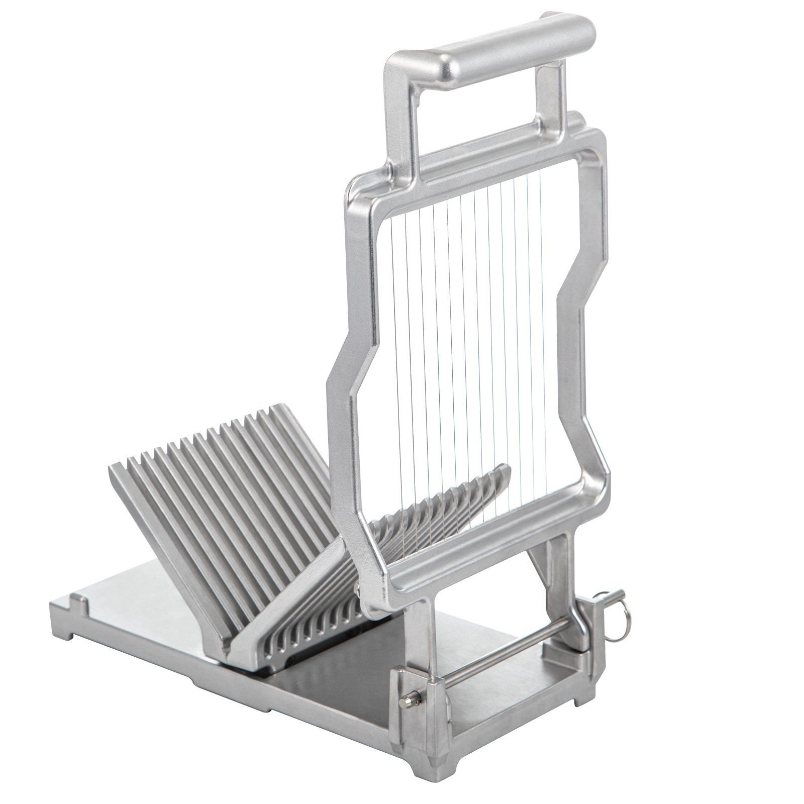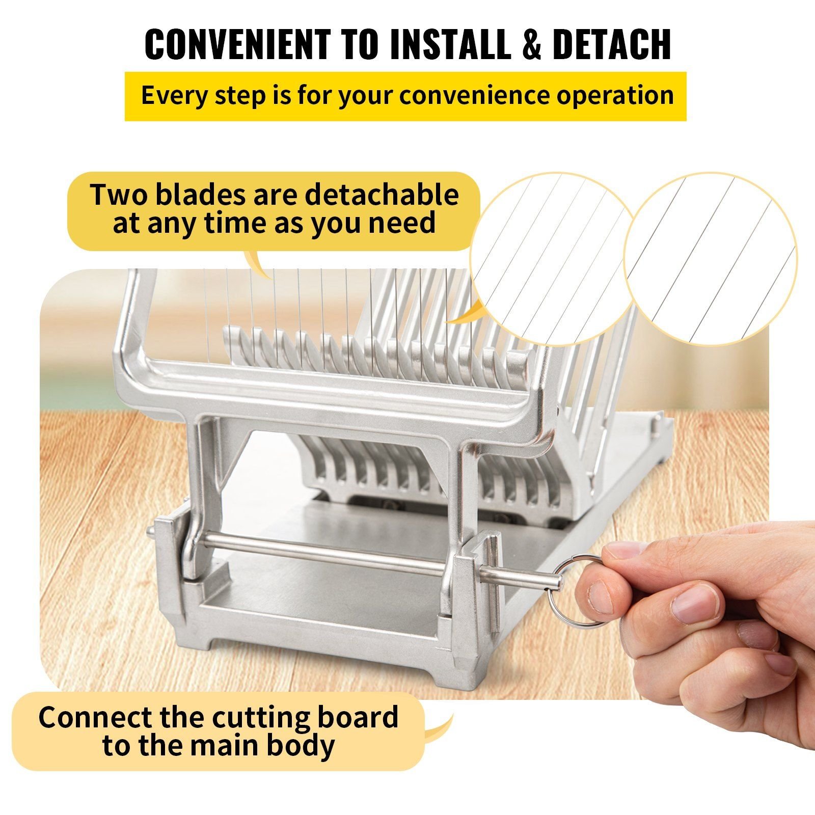 It is made from an aluminum alloy and provides a strong and corrosion-resistant housing. The 304 stainless steel blade wire is tough enough to cut food quickly.